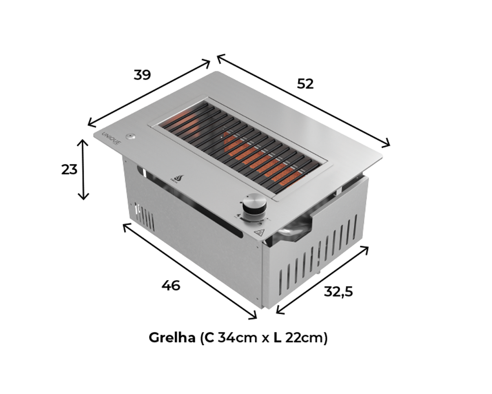 - Controle: 01 botão com regulagem de temperatura dos queimadores.